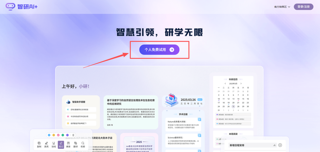 图1.AI智慧研究平台首页点击个人免费试用