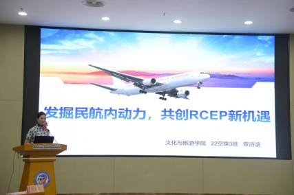 文化与旅游学院2022级空中乘务3班学生覃诗凌作主题发言:“发掘民航内动力,共创RCEP新机遇”。