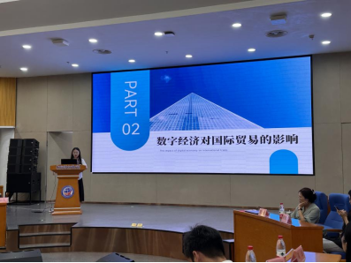 国际贸易学院2021级国际经济与贸易5班学生邱洁作主题发言:“与世界牵手,实现数字经济与国际贸易的双向奔赴”。