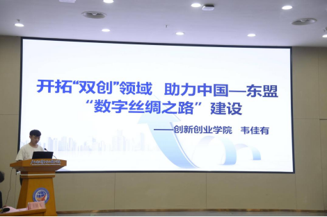 创新创业学院2021级中小企业创业与经营2班学生韦佳作主题发言:“开拓‘双创’领域,助力中国-东盟‘数字丝绸之路’建设”。