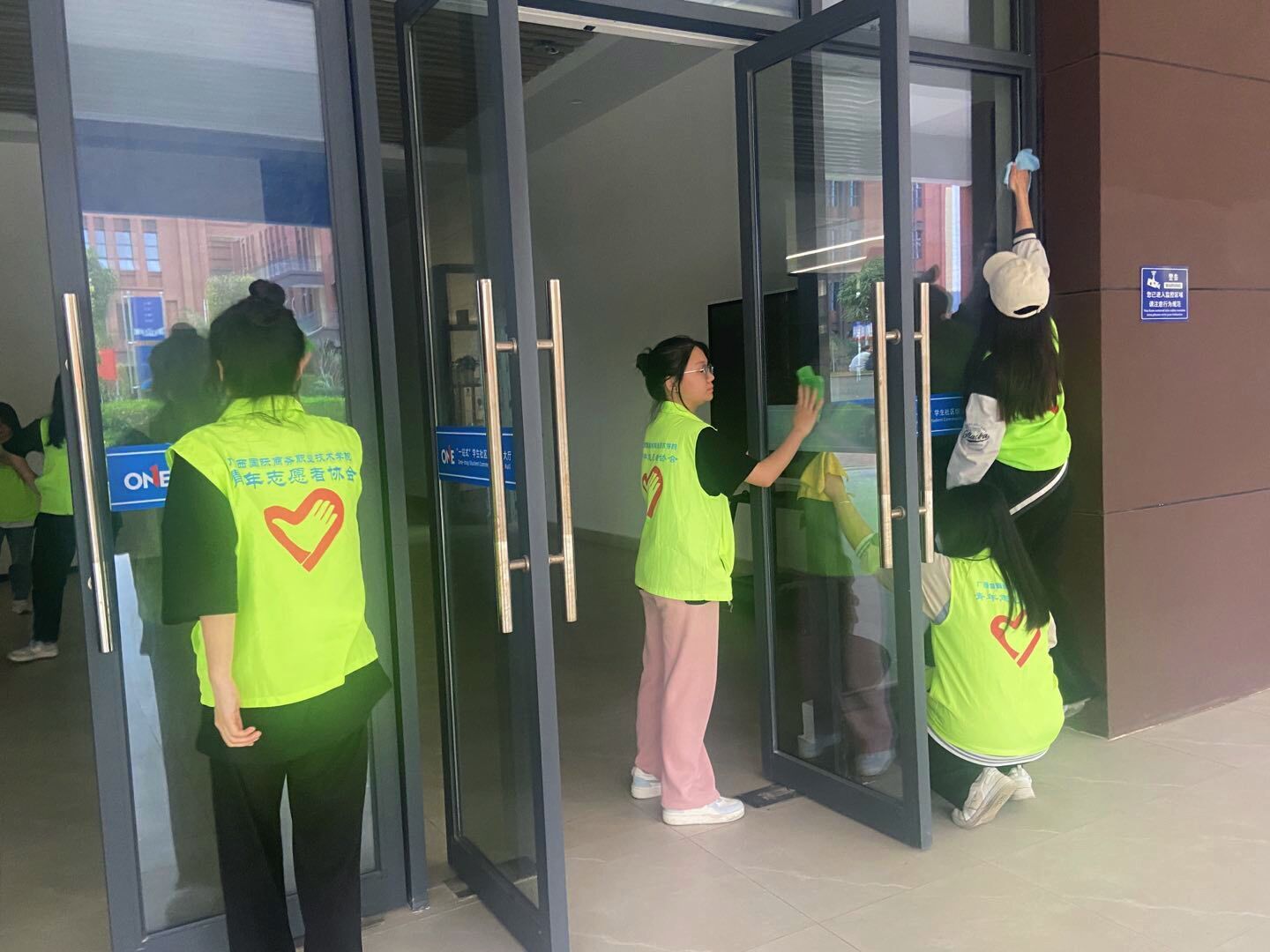 志愿者在清扫“一站式”学生社区服务中心