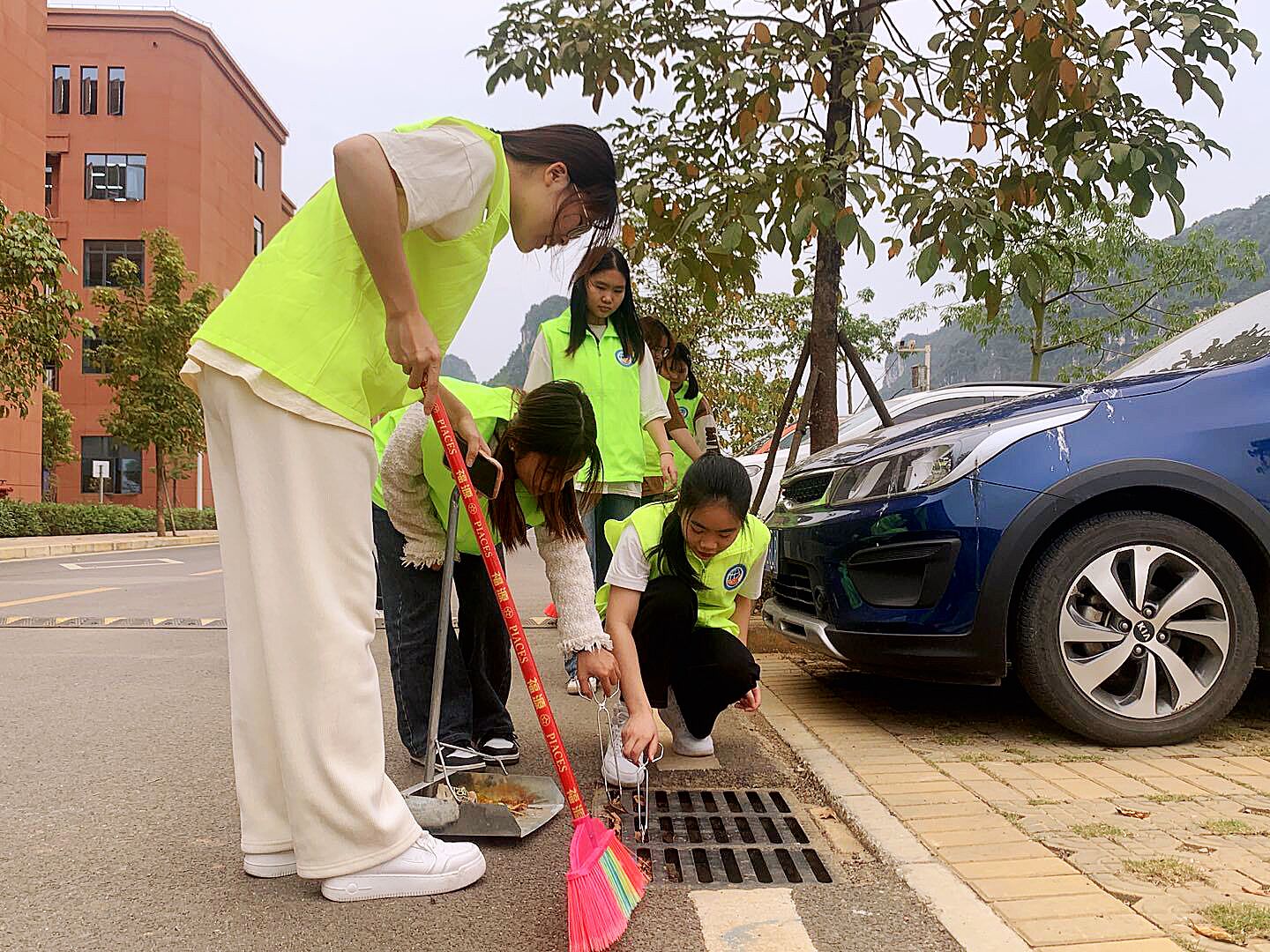 志愿者在清理地面垃圾