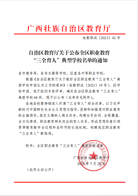 近日,自治区教育厅发布《自治区教育厅关于公布全区职业教育“三全育人”典型学校名单的通知》(桂教职...