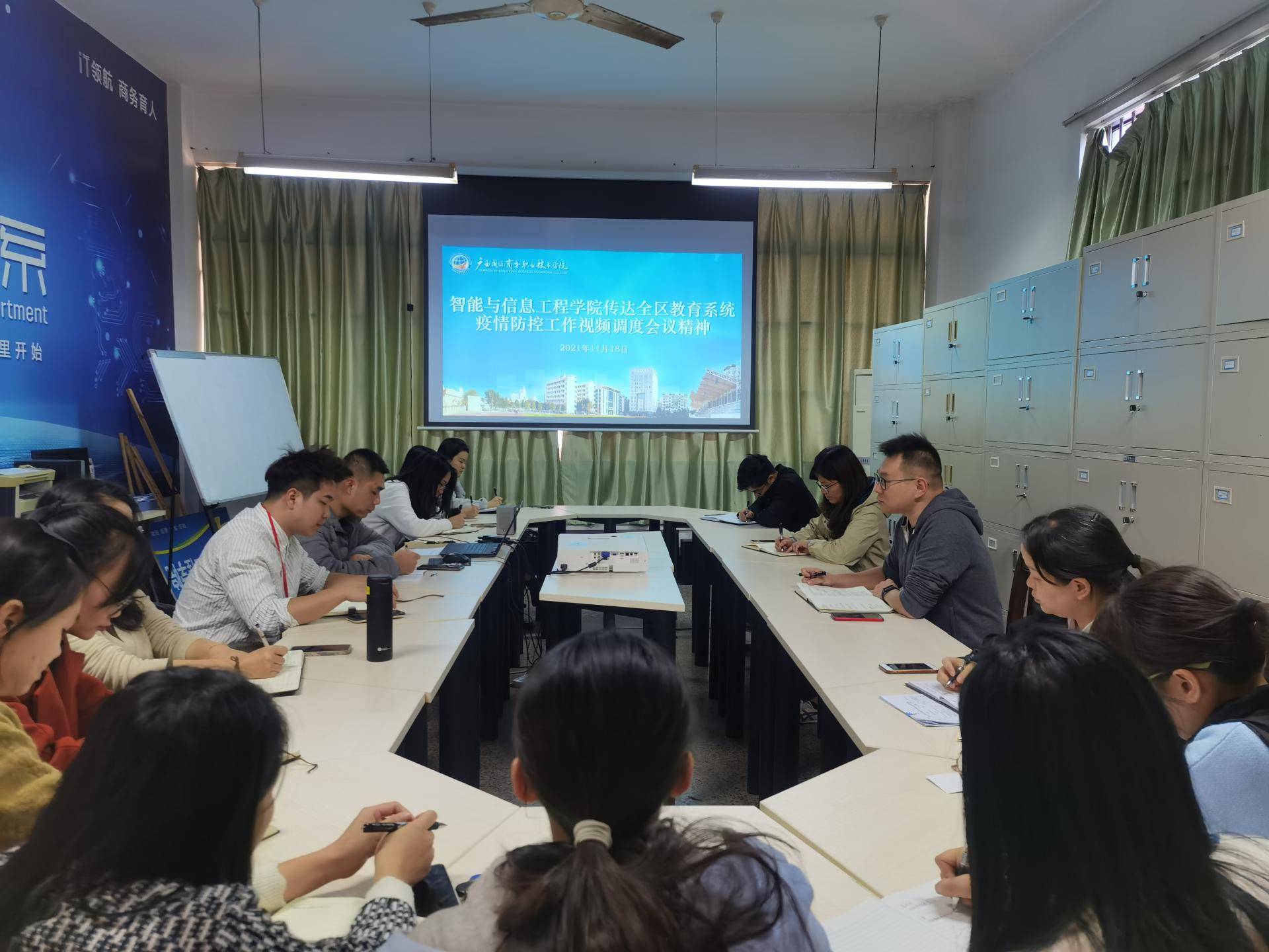 11月18日下午,智能与信息工程学院召开疫情防控专题会议,传达上级会议精神及部署今冬明春疫情防疫工作。党总支副书记李冬、党总支专职副书记潘慧妮、学院副院长周菊瑄、全体辅导员和企业班主任参加本次会议,会议由李冬同志主持。
