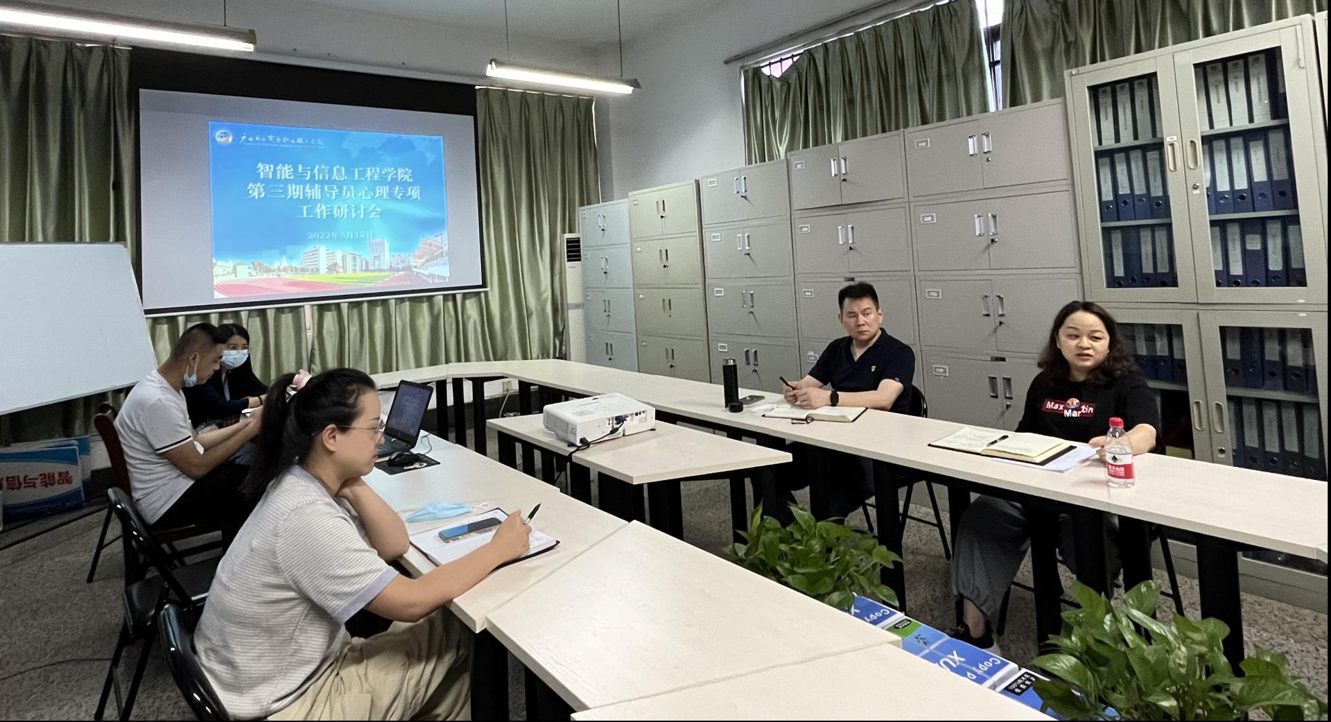 为进一步提高辅导员处理学生心理问题的能力,强化疫情防控期间学生良好心态的管理,智能与信息工程学院于2022年5月12日召开了第三期辅导员专项工作研讨会,本期主题是学生心理工作规范化探讨,会议由学院专职副书记潘慧妮主持,党总支副书记李冬、团总支书记张志波、全体辅导员出席会议。