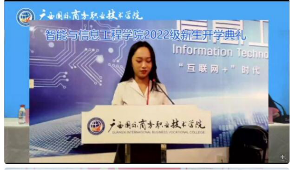 随后我院大数据专业团队教师卢美宏代表教师队伍进行发言,她说,智能与信息工程学院致力于培养德才兼备、服务区域经济的高技能高素质新一代信息技术应用型人才学院,学院与多家优质企业合作办学,并与深圳市瑞视云智科技有限公司共建大数据产业学院。近年来毕业生就业率均在90%以上,广泛受到社会和企业的好评。在今后的三年里,同学们将在这里化茧成蝶,完成人生最重要的蜕变。最后卢美宏老师用三条嘱托寄语新生:成长是一个人的修行;业精于勤荒于嬉;拓展视野,勤于思考。希望新生通过三年的努力,以实际行动践行中国共产党成立100周年大会上的宣言“请党放心,强国有我”。