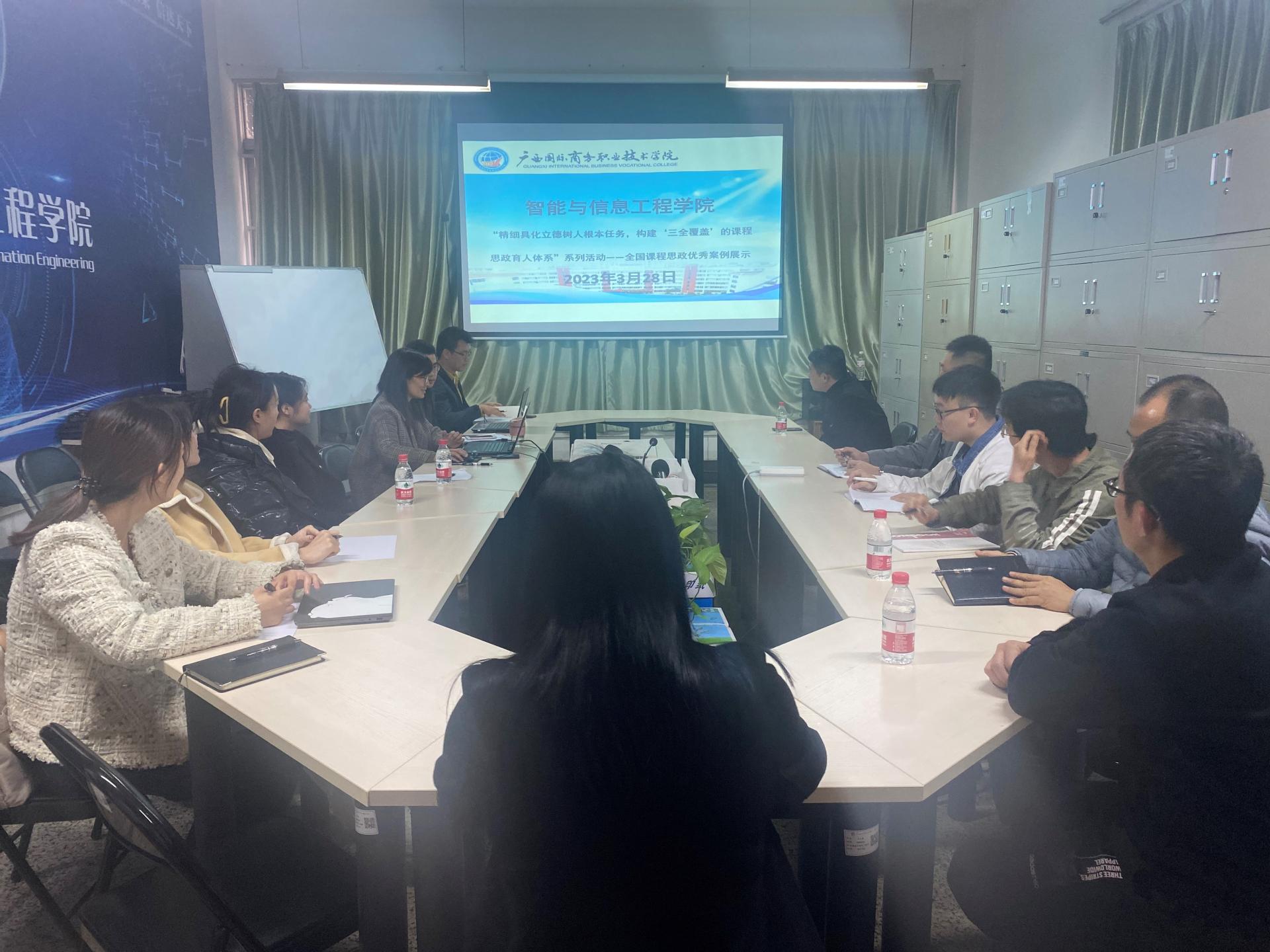 为落实全国职业教育大会精神,全面推进学院“课程思政”建设和 “三全育人”工作,积极推进课程思政教学改革创新,2023年3月28日下午,智能与信息工程学院“精细具化立德树人根本任务,构建'三全覆盖'的课程思政育人体系”系列活动——全国课程思政优秀案例展示活动在3栋208会议室顺利开展。学院全体专任教师和实习实训教研室主任黄华东参加了本次活动。会议由副院长周菊瑄主持。
