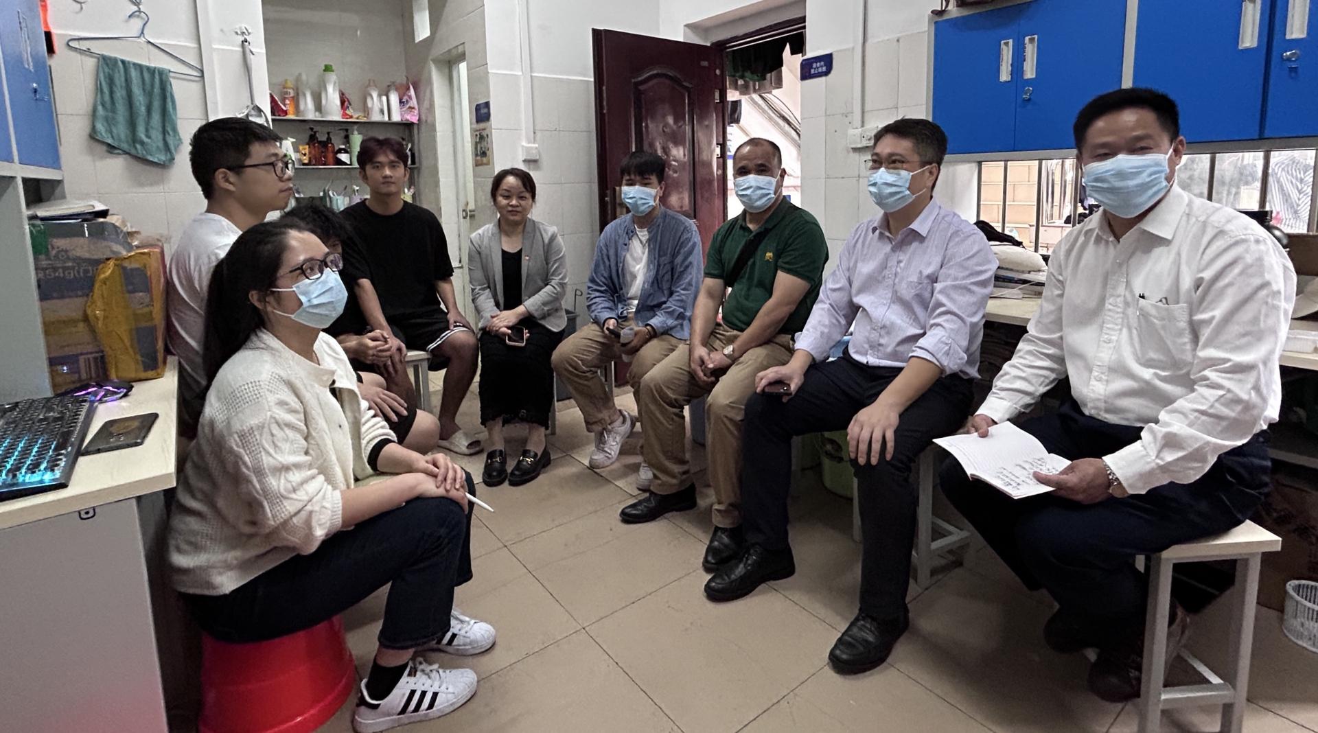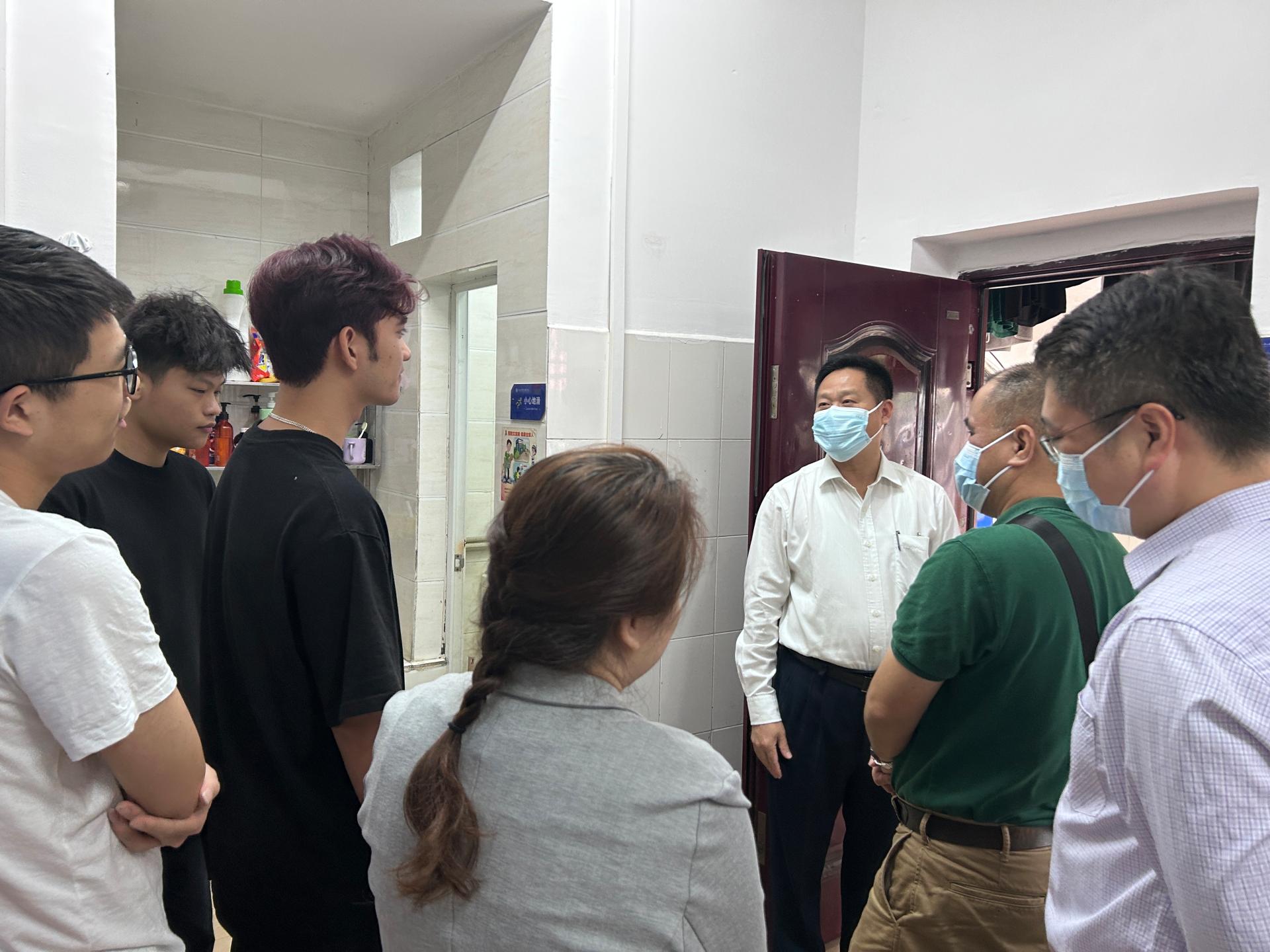 为学习贯彻“习近平新时代中国特色社会主义思想主题教育”,了解和掌握同学们的生活状况,进一步加强学生宿舍安全教育与管理,2023年5月12日下午,学校党委副书记青增计、学校学生工作处副处长鄂诚湘、智能与信息工程学院党总支专职副书记潘慧妮、学工处宿管科李健老师及智能与信息工程学院宿舍管理专项吴彩红老师一行到学生宿舍开展安全工作调研活动。