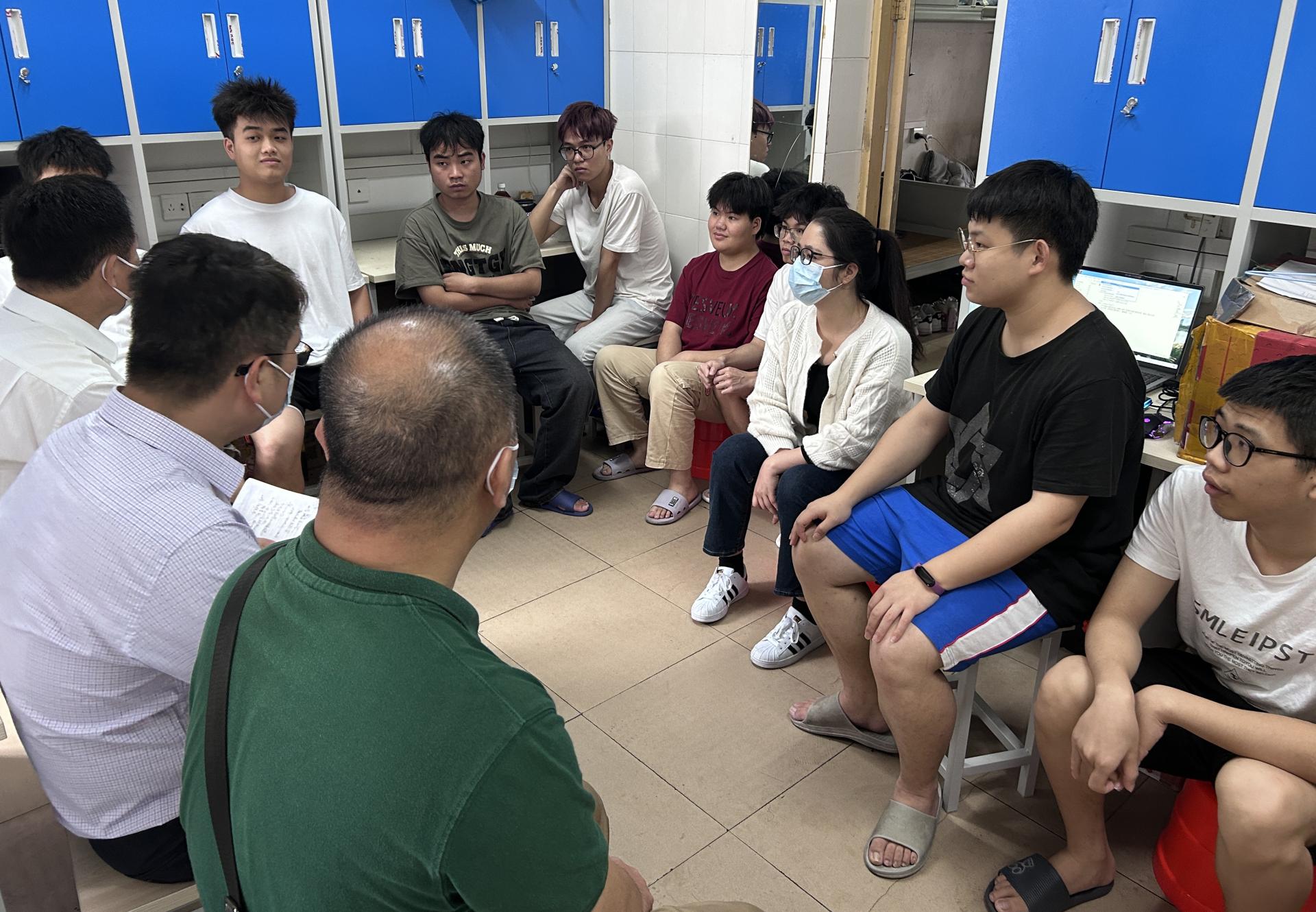 (学校党委副书记青增计和学生工作处副处长鄂诚湘、智能与信息工程学院有关管理人员同学生座谈宿舍安全问题)
