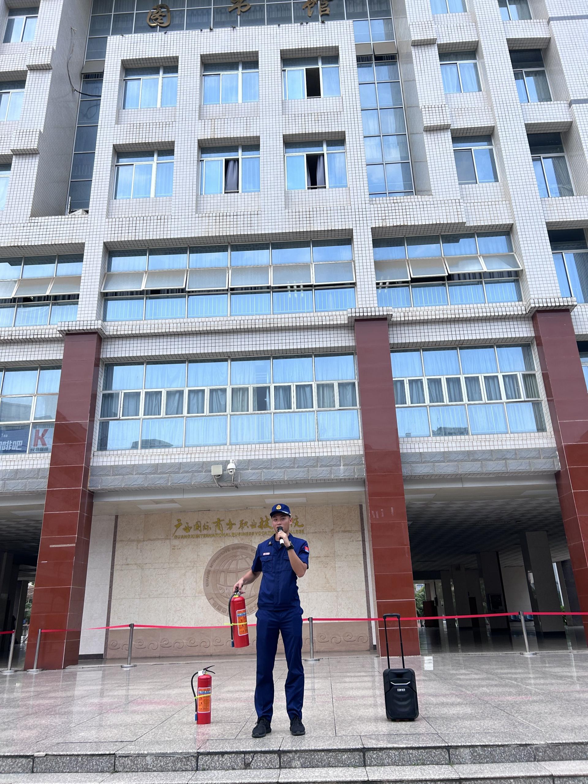 随后在辅导员的带领下,同学们参加消防演习。本次消防演习活动邀请了南宁高新技术产业开发区消防救援大队刘又铭班长给同学们培训消防知识。他结合日常火灾特点,详细讲解了一旦发生火情,每个人应该如何正确地报警、扑救、逃生等消防常识。
