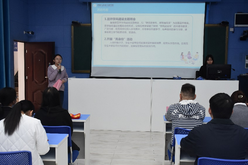 向潇瑶老师给大家介绍了本学期学风建设月的活动内容,本次活动开展时间为11月20日至12月22日,主要分为学风建设月主题班会、入党积极分子和学生干部“亮身份”活动、学院“一对一”帮扶活动、“课堂示范奖”评选活动。