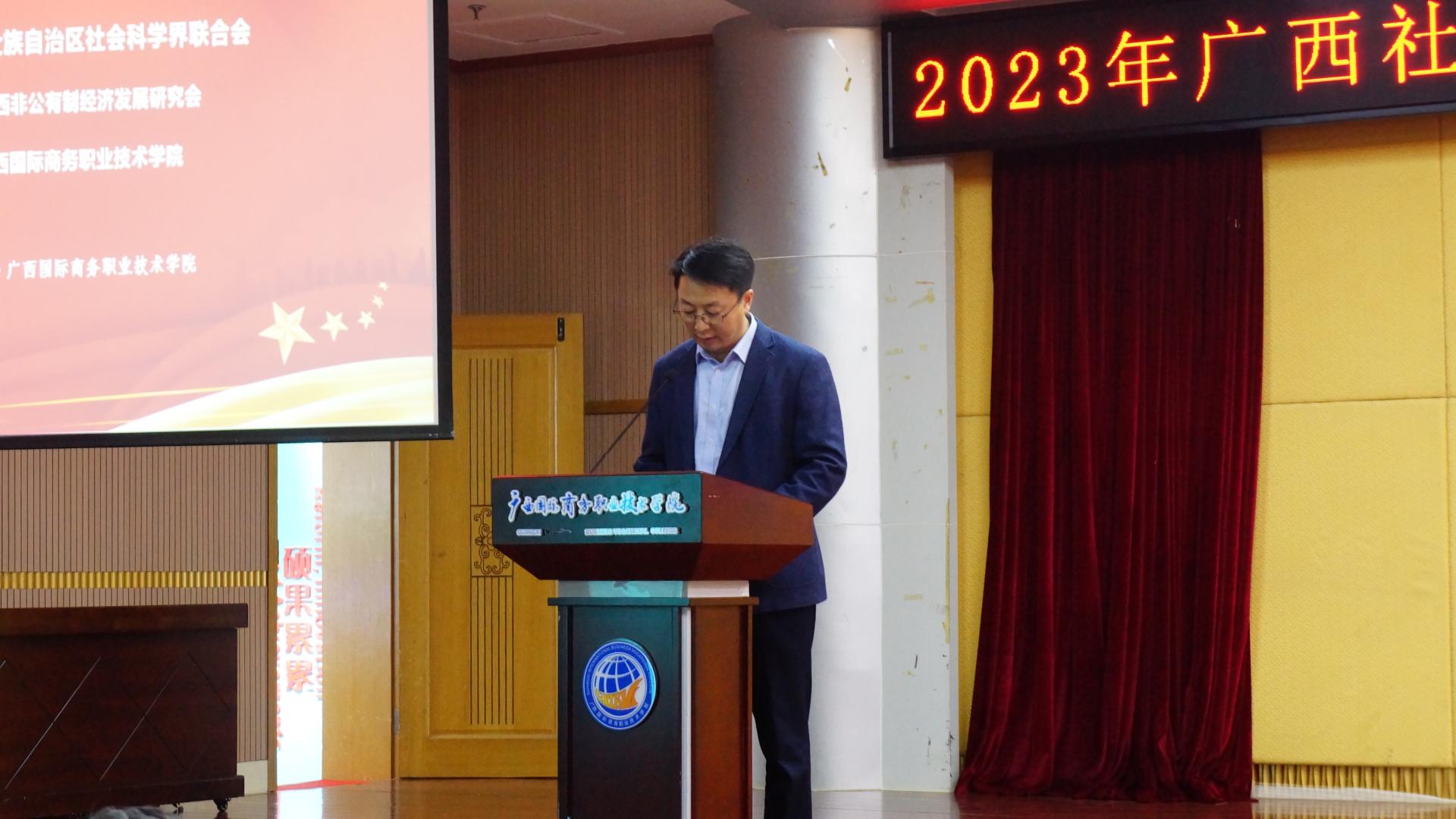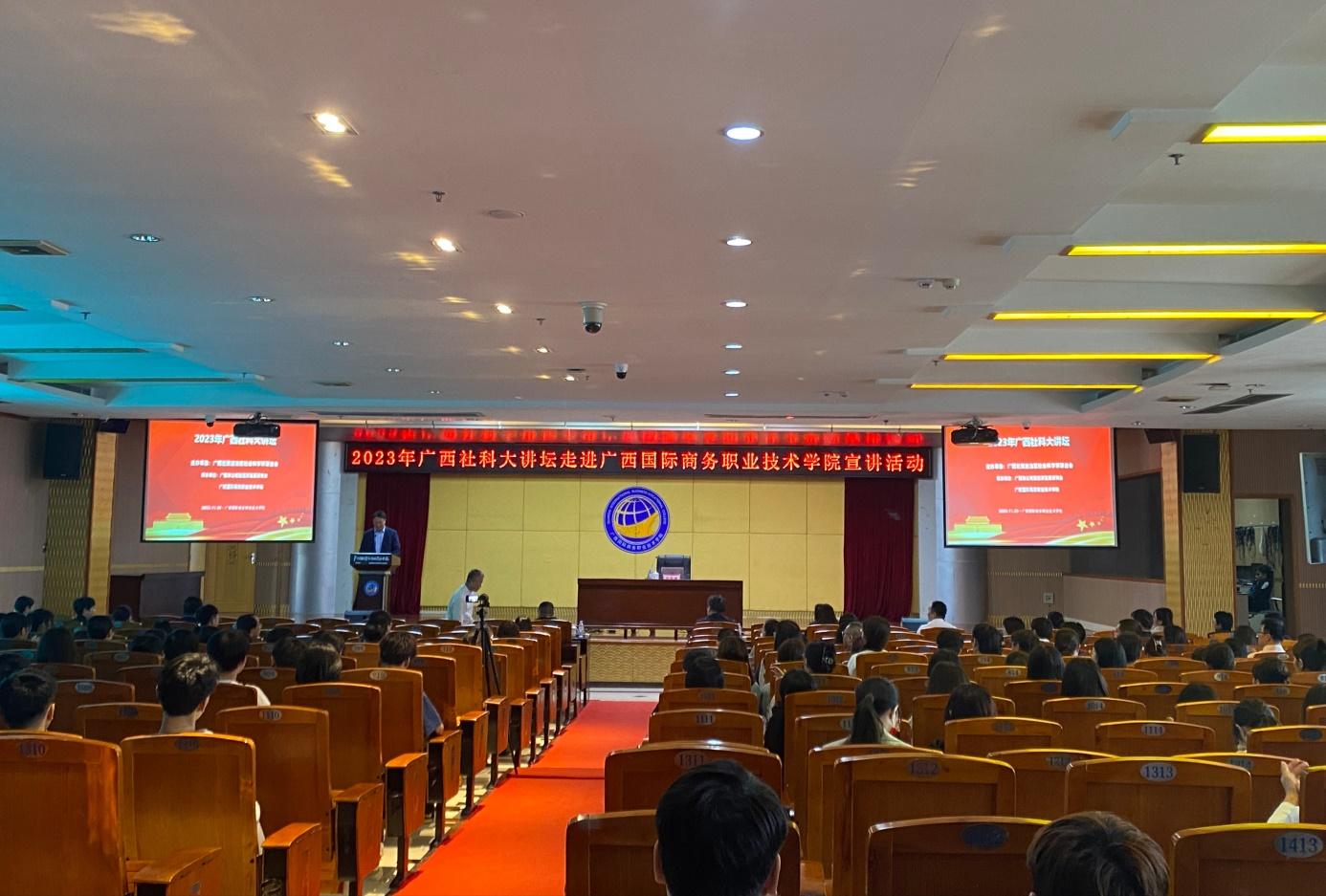 为了全面深入贯彻落实习近平总书记视察广西时提出的关于发展向海经济重要指示精神,推动奋力开创新时代壮美广西建设新局面,11月30日下午,我院组织师生参加大学路校区图书馆 11 楼报告厅的2023年广西社科大讲坛走进广西国际商务职业技术学院宣讲活动,宣讲主题为《大河向海向未来》。主持人为副校长蒋百平。本次活动由主讲人广西交通运输厅平陆运河建设工作领导小组办公室副主任吕英鹰主讲。