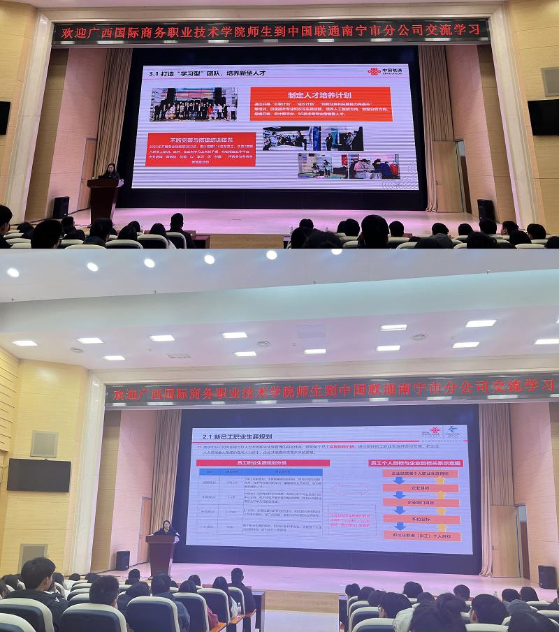南宁联通公司市场部杨经理及人力资源部沙经理分别向同学们介绍了南宁联通业务、技术覆盖范畴及南宁联通岗位晋升方向等,让同学们进一步了解就业市场和就业信息。