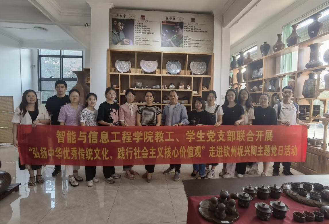 党的二十大报告指出,“坚持和发展马克思主义,必须同中华优秀传统文化相结合”。为贯彻落实党的二十大精神,弘扬中华优秀传统文化,践行社会主义核心价值观,5月25日,智能与信息工程学院教工、学生党支部全体党员赴钦州市开展主题党日活动,深入了解中国四大名陶之一——坭兴陶。