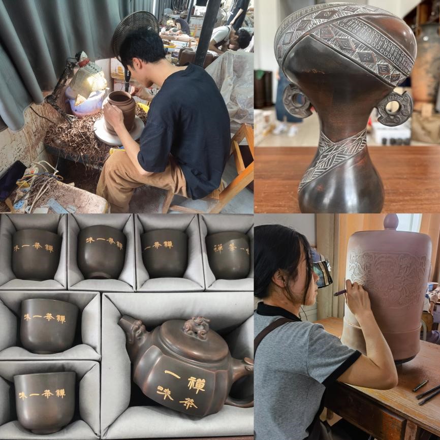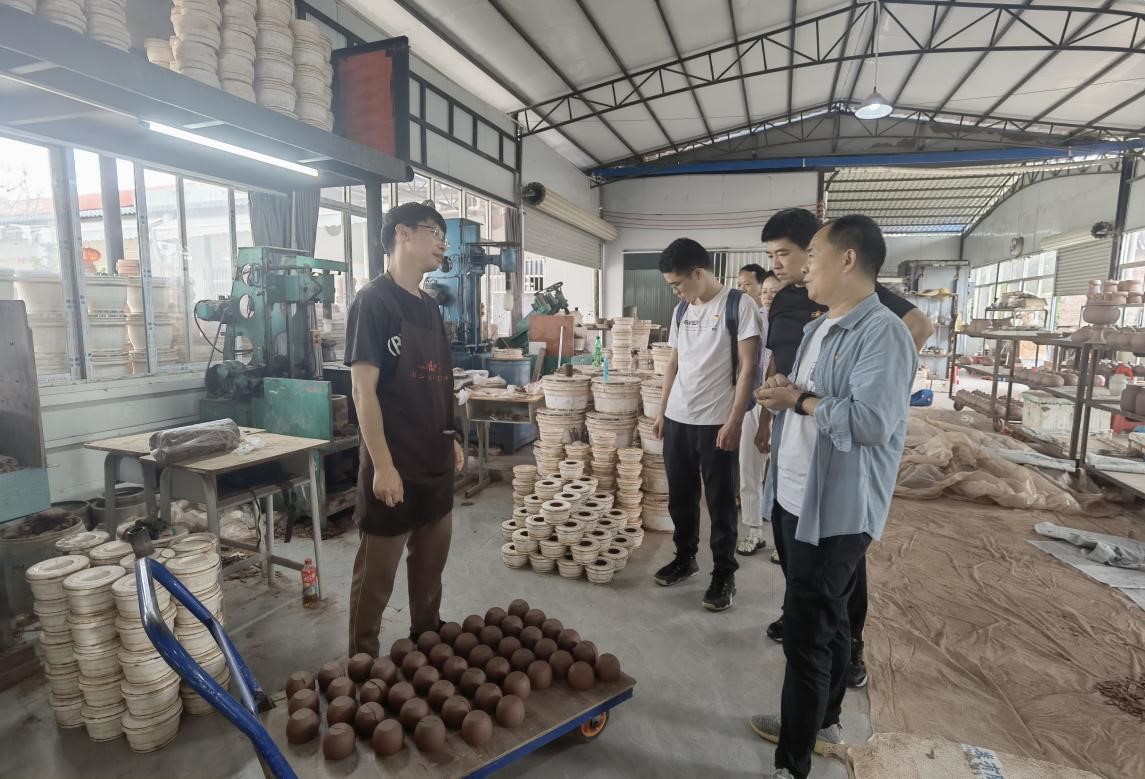 我院党员一行到广西钦州博尔纳陶艺有限公司工厂进行参观学习,认真聆听了坭兴陶的起源、分类、发展历史。钦州坭兴陶作为中国四大名陶之一,至今已有1300多年的历史,是我国传统艺术文化的瑰宝,是国家级非物质文化遗产,更是钦州最具特色的城市名片。党员们从选料、揉泥、拉胚、雕刻等不同的坭兴陶制作工艺中进一步感受到了中国传统手工艺的魅力,加深了对中华优秀传统文化的了解。