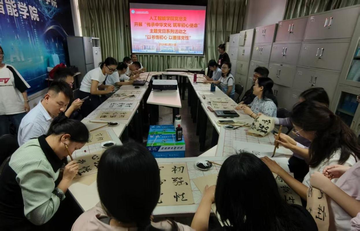 为深入传承中华优秀传统文化,切实筑牢党员初心使命,强化党性修养,人工智能学院党总支开展“传承中华文化 筑牢初心使命”主题党日系列活动。3月31日下午,全体党员在3-208会议室开展系列活动之“以书悟初心 以墨强党性”书法体验课,在笔墨书香中感悟文化力量,锤炼党性品格。