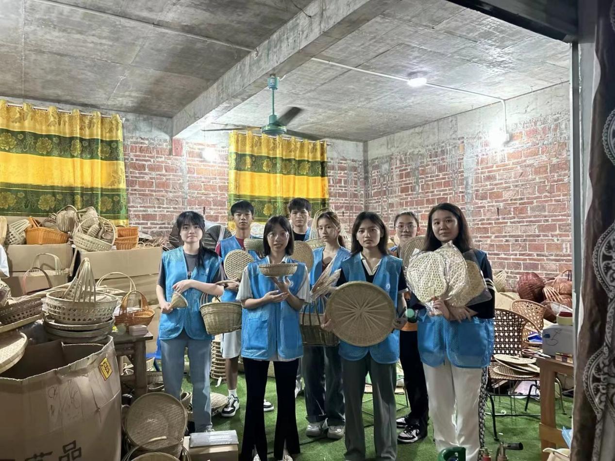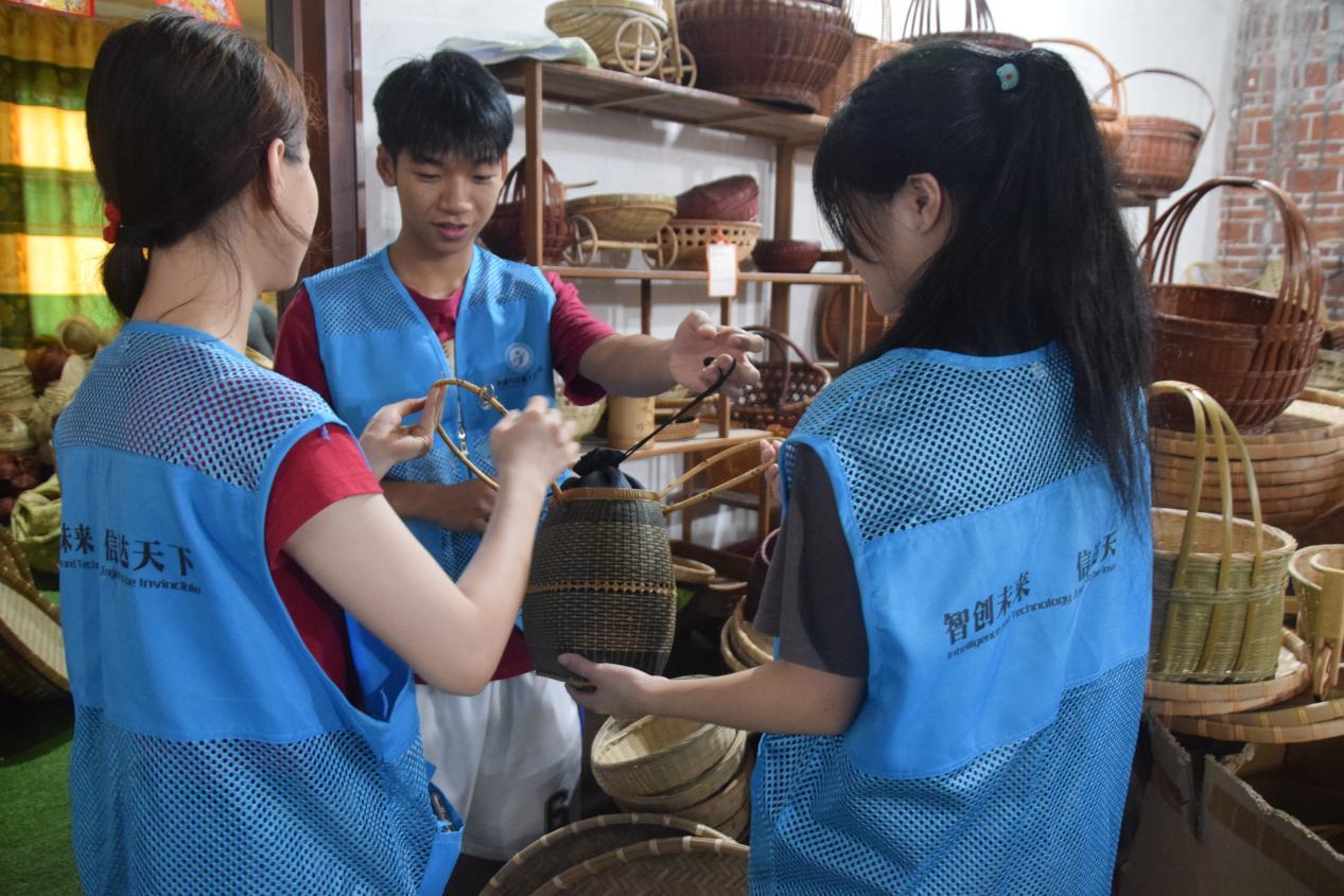 同学们与竹编工艺品合影