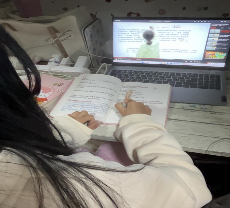 同学在宿舍认真观看学习视频并做笔记