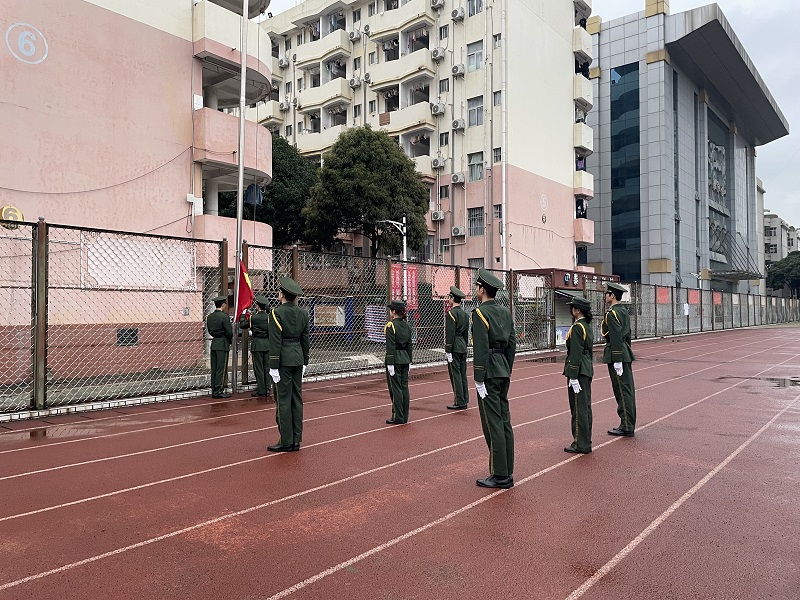 迎着第一缕晨光,仪仗队整齐划一,步伐铿锵有力地向前迈进,伴随着庄严的国歌声,国旗高高升起,迎风飘扬,象征着国家的崛起与繁荣。全体师生肃立,怀着崇敬的心情向国旗行注目礼。