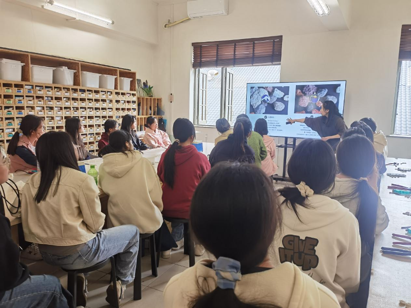活动伊始,工作室主理人韦丽娜现身说法,分享了自身的创业历程。从怀揣对彩色玻璃镶嵌工艺的热爱,到探索艺术与创新创业的融合路径,创始人用亲身经历为同学们打开了新思路,让大家意识到艺术不仅是审美表达,更是驱动创新的强大动力,为同学们在未来职业规划和个人发展中如何挖掘艺术价值提供了宝贵借鉴。