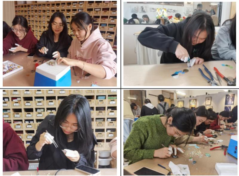 随后,韦丽娜为大家讲解了彩色玻璃镶嵌工艺的起源及发展历程。彩色玻璃镶嵌将玻璃的晶莹剔透与色彩的绚丽斑斓巧妙融合,创造出无数令人叹为观止的艺术佳作。在实践环节,同学们热情高涨。在专业老师的悉心指导下,同学们亲自动手开展玻璃镶嵌体验。从挑选色彩各异的玻璃碎片,到构思图案布局,再到小心翼翼地拼接镶嵌,每一步都凝聚着同学们的专注与创意。大家充分发挥想象力,将手中的玻璃碎片组合成独一无二的艺术作品。