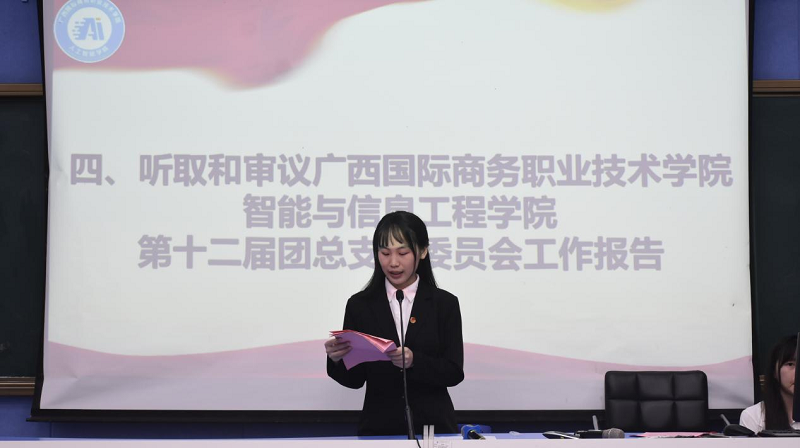7月4日,共青团广西国际商务职业技术学院人工智能学院总支部委员会第一次代表大会在3栋112教室隆重召开。学院党总支专职副书记潘慧妮、校团委组织建设科科长王建国、学院团总支书记韦名富及学院全体辅导员、学生团员代表出席大会。