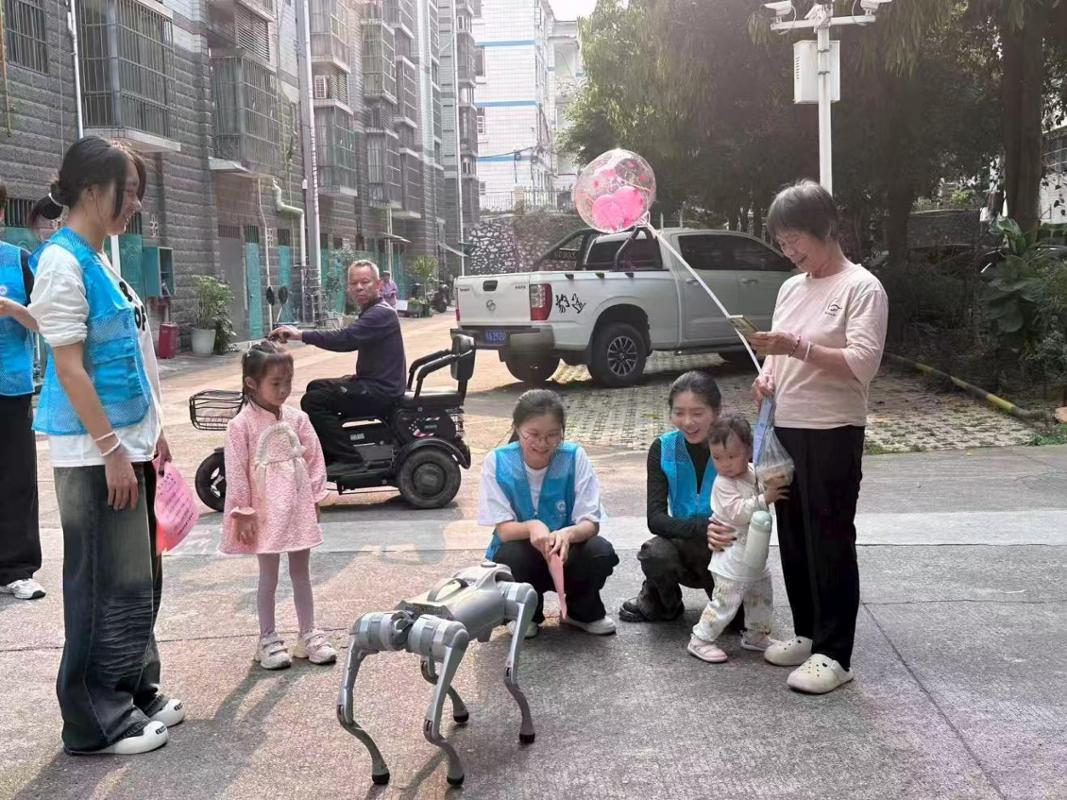 活动现场,我院实训室机器狗成为了孩子们的“明星伙伴”。志愿者们操控机器狗进行趣味表演,灵活的动作、憨态可掬的模样,引得小朋友们阵阵欢笑,为社区小朋友带来了一场有意义的科技启蒙,也让在场所有人感受到了科技与童真碰撞的美好。