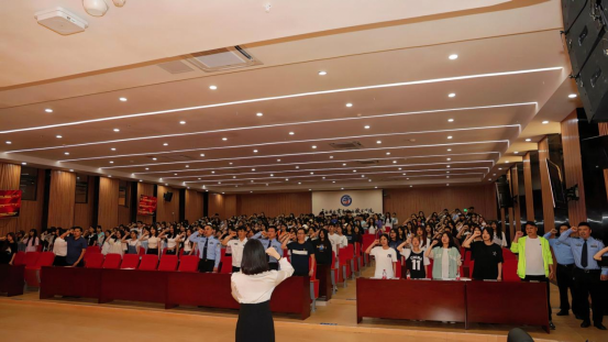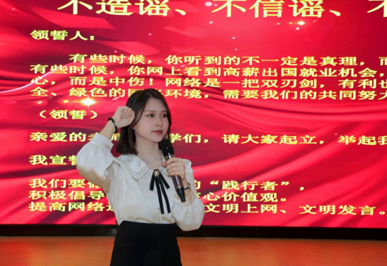 文明上网,尚学明辨,不造谣、不信谣、不传谣、从我做起!来自应用外国语学院2021级商务英语1班的李丽同学作为本次活动的领誓员,引领大家进行宣誓活动。在宣誓环节,大家齐举右手,进行庄严宣誓!